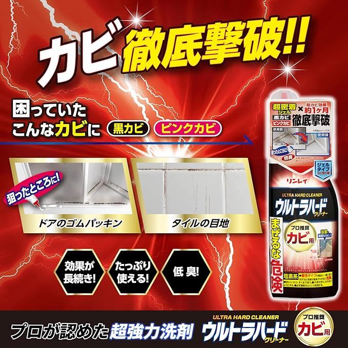 ●「落ちない汚れの最終兵器」でお馴染みのウルトラハードクリーナーシリーズ。●タテ面でも垂れにくい超密着ジェルにより有効成分が効果的に作用することで、今までは諦めていたカビ汚れを徹底撃破。●特殊なヘッドノズルを採用したことで狭小部でも狙った所に塗布可能。●塩素臭も少なく、まさにカビクリーナーの決定版