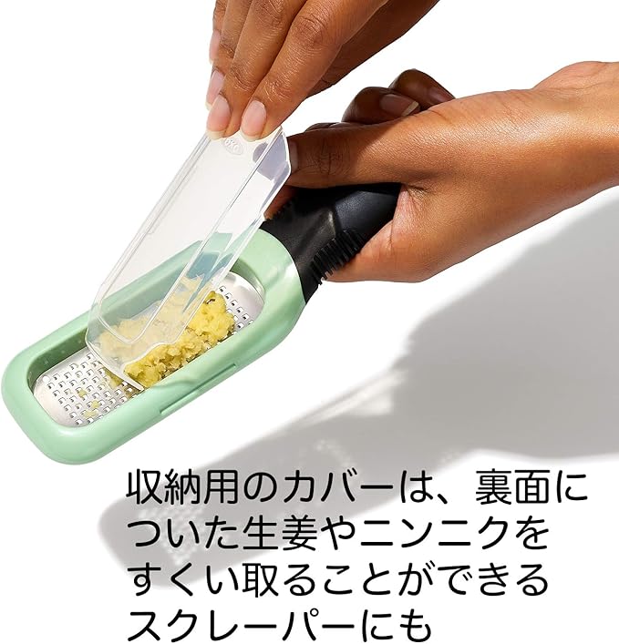刃のカバーは、突起部分がスクレーパーになっており、おろしき器の表面についた生姜やにんにくを簡単にすくい取ることができる