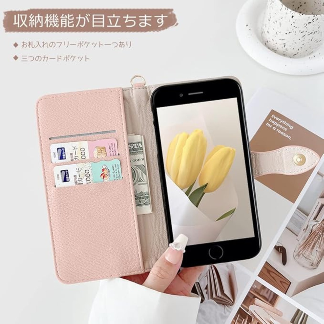 ★【収納&折りたたみ機能】❶スマホケースにはカードポケット3つと内ポケット1つがあり、カード、現金、名刺、運転免許証などを収納でき、生活に便利です。❷スマホケースはスタンド機能付きで、スマホを横置きでき、角度も調整できるので、快適に動画視聴ができます。キッチンでレシピを読みながら料理を作る、長旅の途中で動画を見ながら暇つぶしをしたり。両手が解放され、お気軽に読書やビデオの観賞を楽しむことができます。
