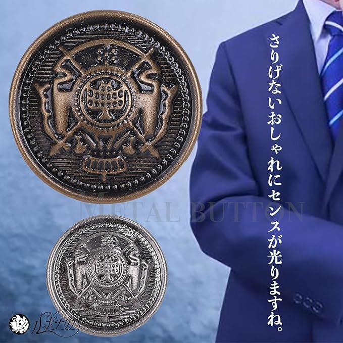 市販のブレザーやジャケットのボタンとは一味違うかっこよさです。さりげないおしゃれにセンスが光りますね。男女問わずお使いいただけるデザインですので、ご家庭のストック用としても大変便利です。