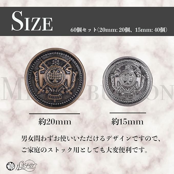 ルボナリエ メタルボタン アンティーク レトロ コート用ボタン ジャケット ブレザー アクセサリー 20mm 15mm (シルバー 60個)