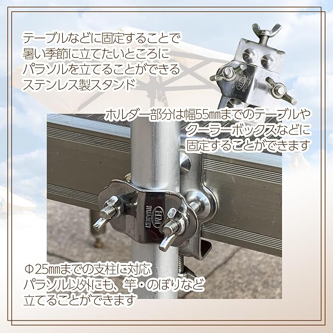 パラソルホルダーを支柱やテーブル等に固定し、釣りやアウトドアで使用するパラソル、竿、のぼりポールを固定するステンレス製スタンドです。