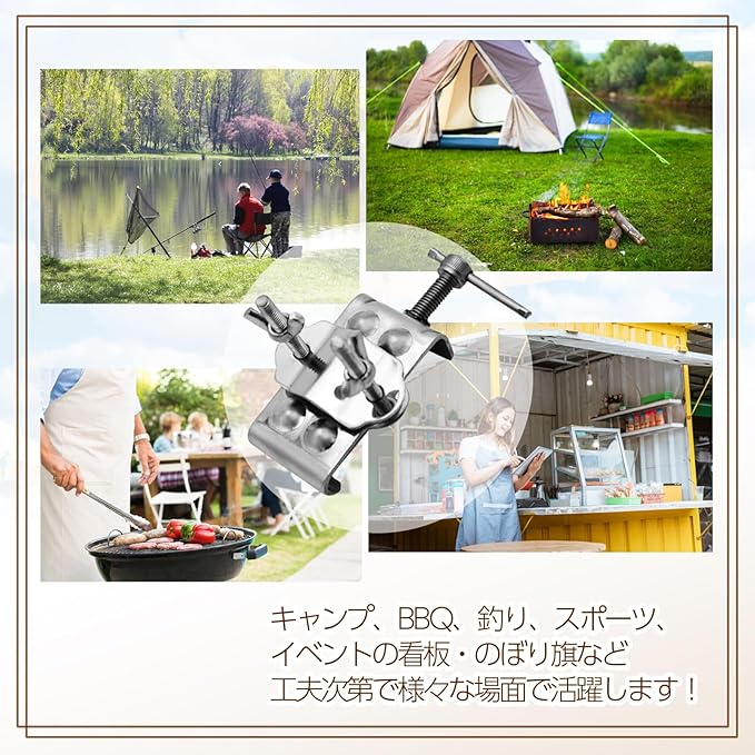 釣りをはじめ、イベントでの、看板、のぼり旗、スポーツイベントなどにもご利用できる便利なパイプホルダー。アウトドア、バーべキューでの日除け用パラソルを固定するのに便利な金具となります。