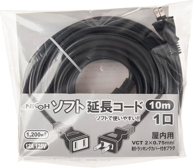 NICOH(ニコー) ソフト延長コード 1個口 12A 10mコード 1200Wまで 耐トラッキングカバー付 ブラック NCT-1210BK