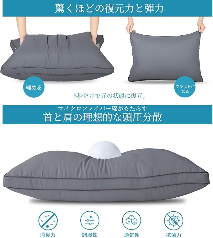 【高級ホテルの極上寝心地をご自宅で】 まるで五つ星ホテルに泊まっているかのような贅沢な寝心地。高品質ポリエステル使用で頭と首を優しく包み込み、極上のふわふわ感が日々の疲れをしっかり癒します。