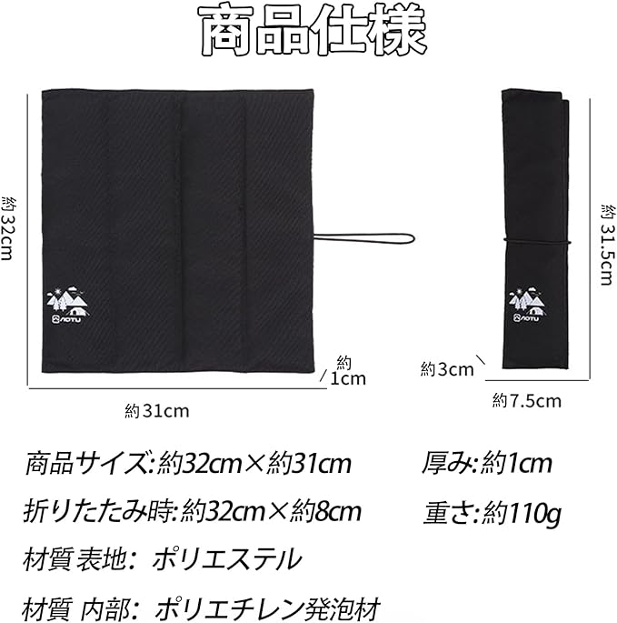 【製品仕様】 サイズ:折り畳み時・縦約31.5cm 横約7.5cm 厚み約3cm ご使用時・縦約31cm 横約32cm 厚み約1cm バリエーション:8種類・ ブラック、カーキ、ネイビー、グリーン、ピンク、ブルー、茶色、草色、 素材:ポリエステル、ポリエチレン発泡材 重量:約110g セット内容:本体