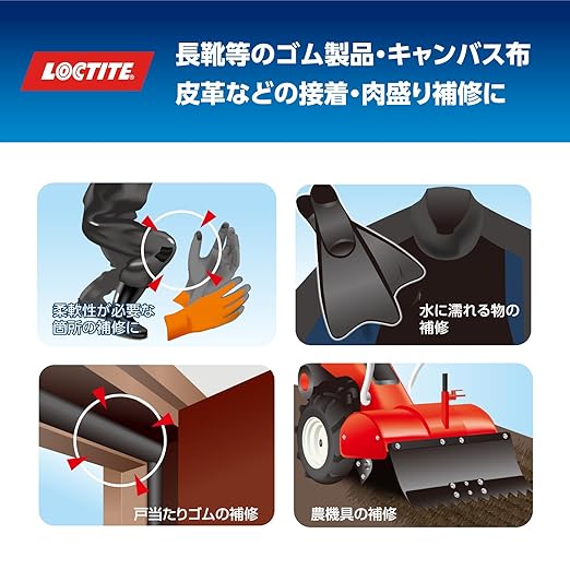 低粘度:長靴や戸当たりゴム、靴底などゴム状物質の補修に適しています。