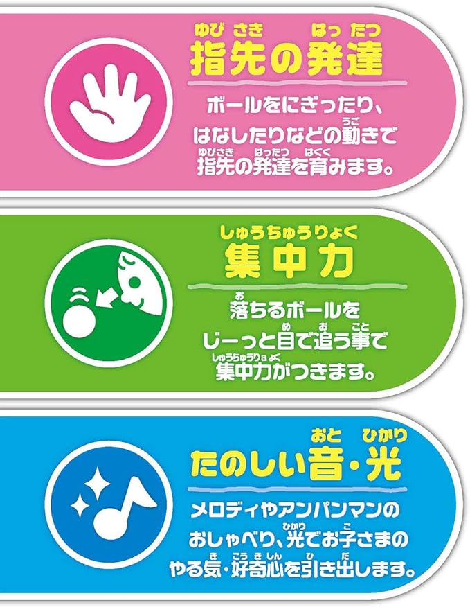 ボールが回転しながら落ちてきて、アンパンマンのおしゃべりとメロディが流れます。