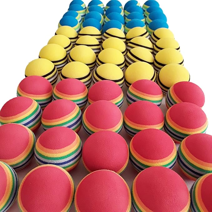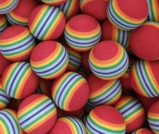 この商品は、ゴルフ練習用ウレタンスポンジボール36個セットになります。<br> 色は、赤・青・黄色をベースにしたレインボーカラーとなっております。<br> ゴルフで飛距離を伸ばしたい方にお勧めの商品となっております。<br> 打った時の球筋がわかるように、ボールにラインが入っています。 <br>【サイズ】 約42mm 【重量】 約4g