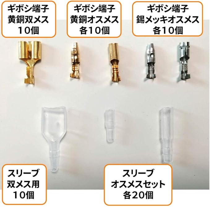 【セット内容】ギボシ端子 黄銅双メスx10 ギボシ端子 黄銅オスx10個 黄銅メスx10 ギボシ端子錫メッキオスx10 ギボシ端子錫メッキメスx10 スリーブ双メス用x10 スリーブオス用x20 スリーブメス用x20