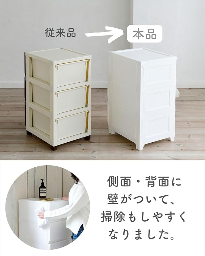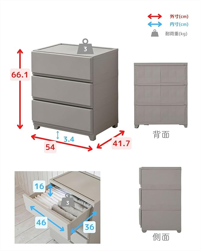 ●側面と背面も壁付きでホコリが入りにくいチェスト ●収納目安(引出し1段あたり): Yシャツなら約8枚、バスタオルなら約6枚、セーターなら約6枚 ●引出し内寸: 幅46 奥行36 深さ16cm ●耐荷重: 天板(約)3kg、引出し1段あたり(約)3kg●工具不要、かんたんに組み立て可能 ●側面と背面をパネルで覆い、ホコリ溜まりを軽減 ●中が透けないのでお部屋がすっきり ●お部屋になじむ、ツヤのないマットな質感 ●引き出しはストッパー付きで抜け落ち防止 ●本体下隙間: 高さ約3.4cm ※脚部は付け外し可能ですが、外す際は養生が必要です。 ※本品にはキャスターは取り付けできません。