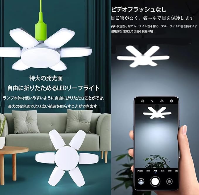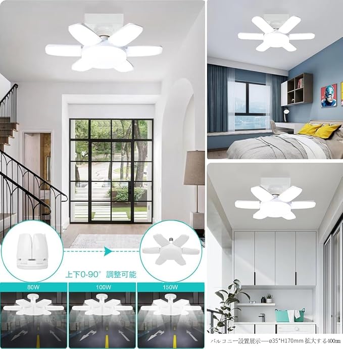 【折りたたみ式&角度調整可能】:ペンダントライトには折りたたみ式LEDパネルが6つあります。上下0-90 自由に調整して、照明角度が最大360 に達し、通常のLEDガレージライトより照明範囲も広くなります。