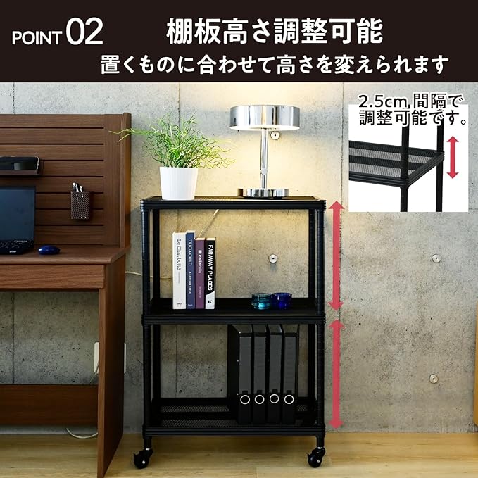 【メッシュの棚板】網目が細かい棚板なので、物が落ちにくくお部屋の圧迫感も軽減できます。棚の高さを2.5cm間隔で調整可能です。