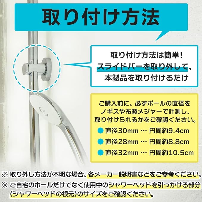 ※ご自宅のポールだけでなく使用中のシャワーヘッドを引っかける部分のサイズ(シャワーヘッドの根元のサイズ)をご確認ください。
