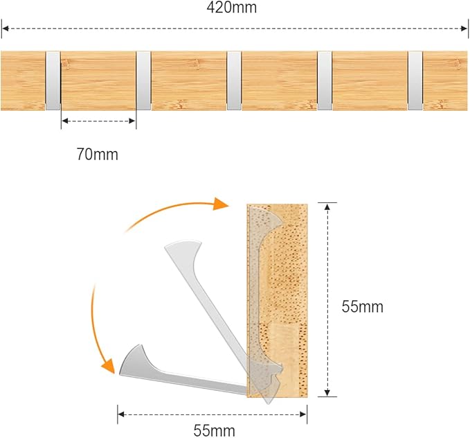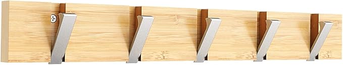 Anjuer ウォールハンガー 壁取り付け式コートラック 5連フック 壁掛けフック 収納家具 物干しハンガー 帽子・洋服・コート掛け 木製(銀フック折り畳み型)