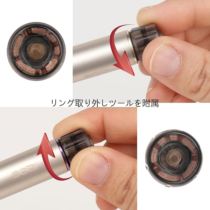 リング取り付け方法:同梱のリング取り外しツールをホルダーのリングにはめ、反時計回りに回してロックを解除します。新しいリングをホルダーに装着し、リング取り外しツールを使って時計回りに回して固定してください。