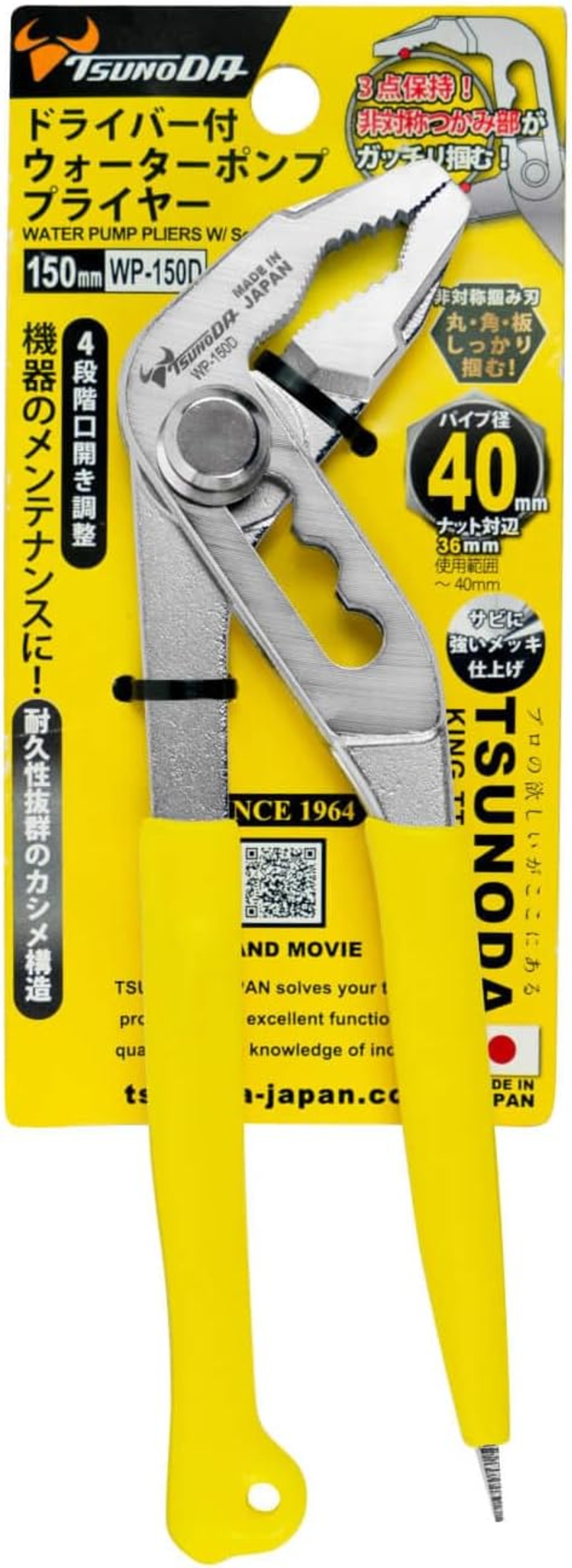 ツノダ(Tsunoda) ウォーターポンププライヤー ドライバー付 小型 4段階調整 パイプ外径 40mmまで 日本製 150mm WP-150D