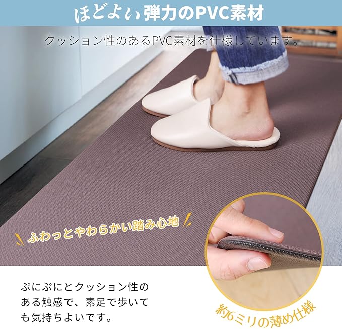 【低反発だから足元が楽】適度な厚み6mm、柔らかくクッション性のあるPVCキッチンマット。モチモチとした踏み心地で、【体圧分散効果】があります。身体の一部分だけに強い圧力がかからないようにすることで、足腰の負担を軽減します。物が落下しても衝撃を吸収し、傷や凹みからフローリングを守ります。こちらのマットは6mmの厚さを感じず、ロボット掃除機もスイスイのぼります。