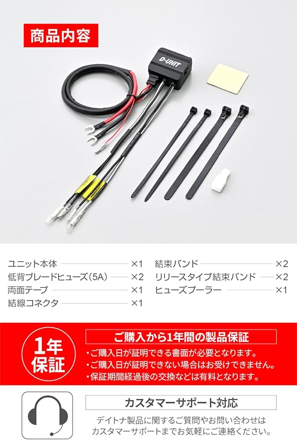 商品構成:ユニット本体 1、低背ブレードヒューズ5A(組み込み済み) 2、両面テープ 1、結線コネクタ 1、結束バンド(150mm) 2、結束バンド(リリースタイプ)(150mm) 2、ヒューズプーラー 1