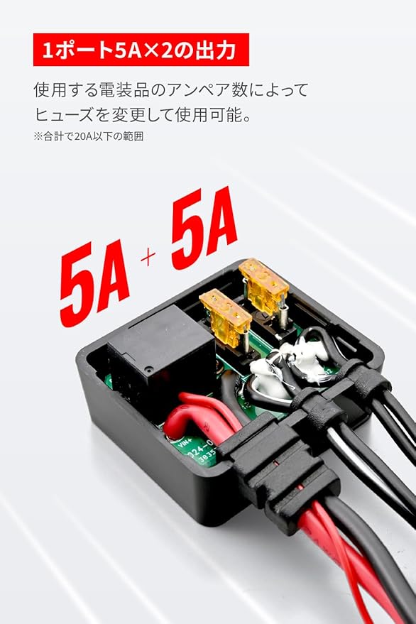 内蔵ヒューズの交換で必要なアンペア数に変更可能。(合計で20A以下の範囲)