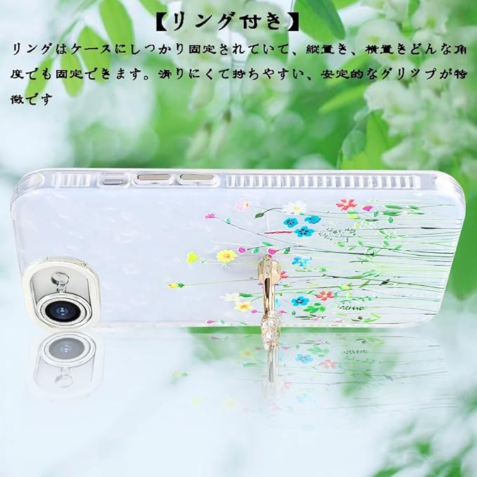 YUYIB iPhone 16e 用 ケース リング付き キラキラ レンズフィルム付き カメラ保護 かわいい 花柄 キャラクター ストラップホール おしゃれ 女性人気 耐衝撃 スマホケース アイフォン16e 携帯カバー (花柄1, iPhone 16e)