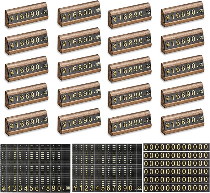 ELECTRO-WEIDEWORLD プライスカード 木製 おしゃれ 値札プレート セット プライスカード設置台20個 0-9プライスカード40本+0プライスカード6本(総計72個)付き プライスキューブ プライスタグ 価格表示 店舗 プライスキューブ ディスプレイ 万の値まで表示可能 (黒胡桃材/金文字,台座20個セット)