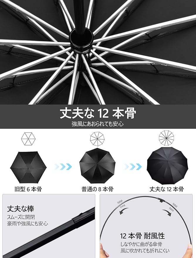 【12 本骨強靭耐強風設計】 柔軟性と高強度を兼ね備えた 12 本骨構造を採用し、折りたたみ傘 強風に強い性能を最大化!防食加工済みの丈夫なフレームは錆びにくく、激しい風雨にも折れず曲がらず、おりたたみ傘 頑丈かつ軽量丈夫折りたたみ傘として長期的な耐久性を誇ります。強風時に万一ひっくり返っても、風の流れを受け流す特殊設計により、閉じるだけで簡単に元の形に復元し、折りたたみ傘最強の耐圧性を発揮します。120cm の広い傘面で確実な遮蔽性を提供しながら、高強度素材による折り畳み傘 軽量 頑丈なバランスで持ち運びもストレスフリー。メンズ 折りたたみ傘 風に強いデザインに加え、紫外線カット機能付きの日傘 風に強い丈夫な日傘としても活用でき、日常通勤からアウトドアまで幅広い用途に対応する丈夫な折り畳み傘です。