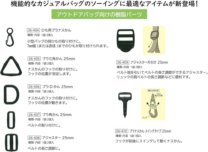 機能的なカジュアルバッグのソーイングに最適なパーツ。