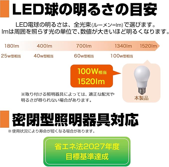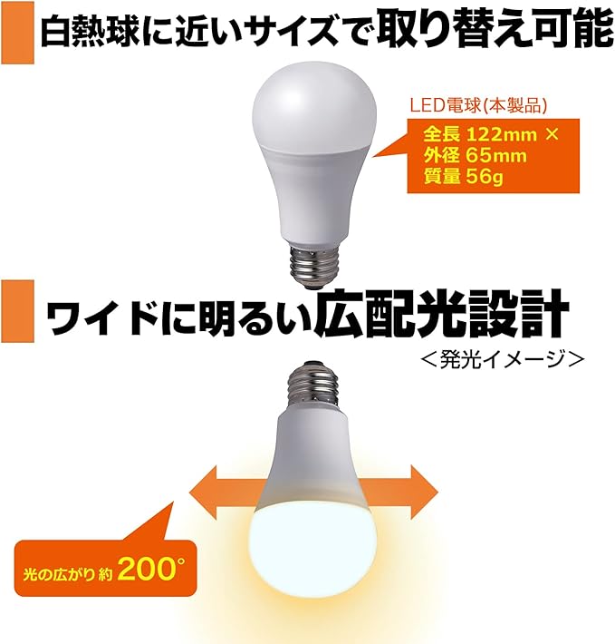 ■交流電源:100V 50/60Hz共用 ■口金:E26 ■サイズ:全長122X外径65(mm) ■質量:56g ■定格消費電力:14.2W ■定格入力電流:250mA ■設計寿命:40000h ■全光束:1520lm ■エネルギー消費効率:107.0lm/W ■光色:電球色相当 ■屋内用