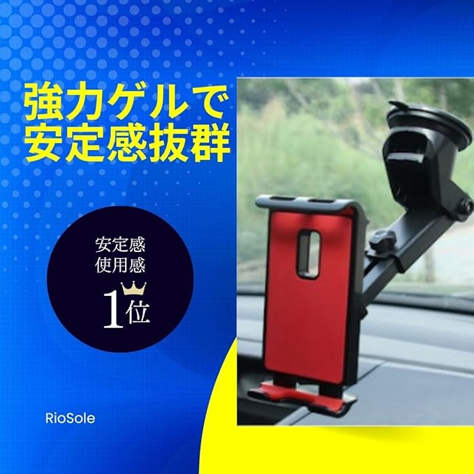 [RioSole]タブレットホルダー 車載ホルダー 車 運転席 タブレットスタンド モニタースタンド 粘着ゲル 強力吸盤 車載 ダッシュボード用 伸縮アーム 360度回転 充電可能ホール付 簡単取付 転落防止 防振 伸縮 (ブラック)