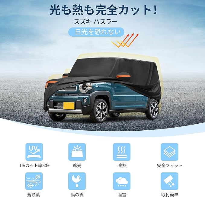 X AUTOHAUX 【スズキに対応ハスラーHustler用】345*148*150cm ボディカバー スパンレース綿 新型100%防水生地&5層構造 裏起毛 塗装面保護 梅雨 破れにくい 雹対策 防風ロープ付き 運転席側ジッパー 夜間安全警告 日焼け防止 凍結防止 霜除け