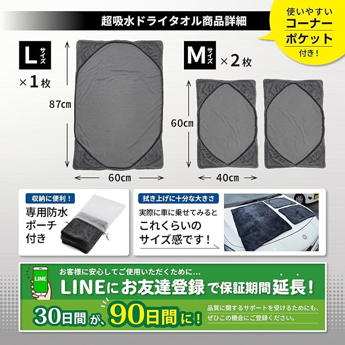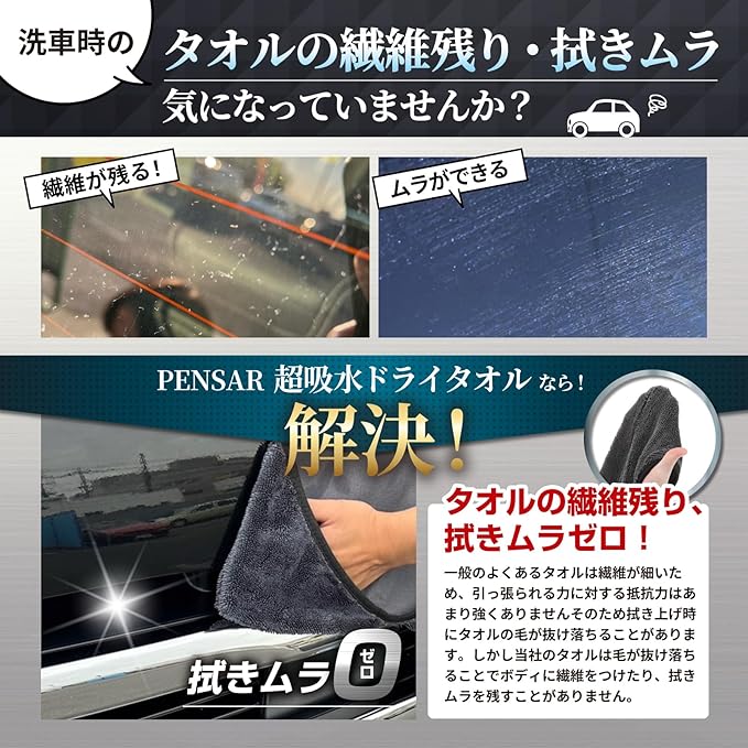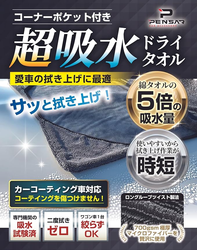 PENSAR 洗車タオル コーナーポケット付き 超吸水 拭き上げ 時短 クロス 傷つかない 極厚 700GSM マイクロファイバー ドライタオル 専門機関吸水試験済 意匠権申請済 (3, M,M,L)