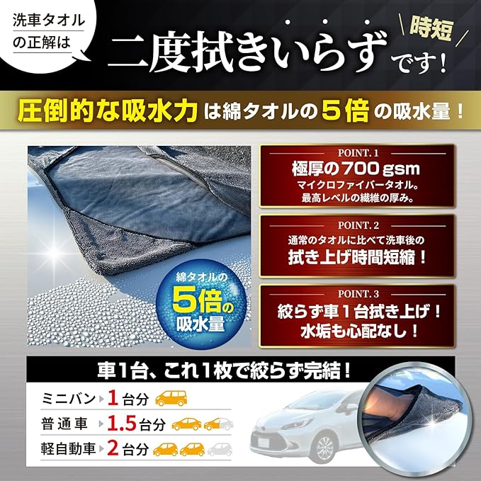 ✅圧倒的な吸水力で二度拭きいらず! 「洗車後の水拭き、何度も拭き直すのが面倒…」そんな悩みを解決するのが、この拭き上げタオルの圧倒的な吸水力!綿タオルの約5倍の給水量を誇り、広いボディもサッと一拭き。二度拭き不要で、洗車時間を大幅短縮できます。