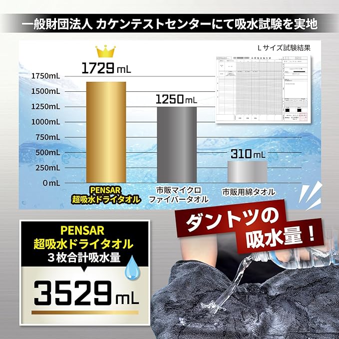 ✅一般財団法人で吸水試験実施済み!品質はお墨付き 「本当に吸水性が良いの?」その疑問を解消するために、一般財団法人による吸水試験を実施。その結果、優れた吸水性が立証されました。品質には自信を持ってお届けします。