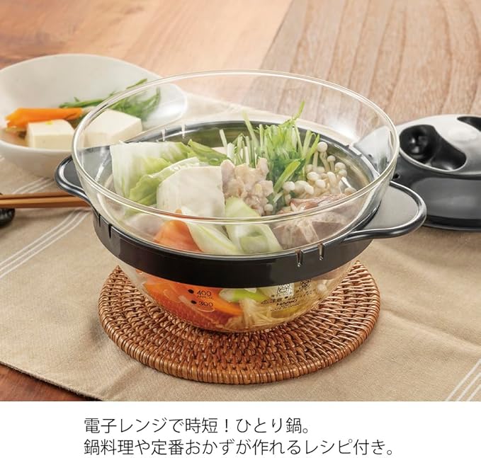 【ガラスのレンジおかず鍋】 野菜やお肉を入れて電子レンジ加熱するだけで、簡単ひとり鍋の完成です。いろいろな食材が食べられるので、栄養バランスが気になるときにもおすすめ。