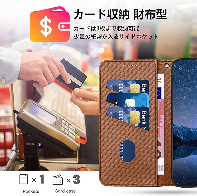 【便利な機能】このケースには3つのカードスロットがある、1つのカードスロットには、カードを取り出しやすいように大きな穴が開いている、内側には大きなポケットがあり、名刺や定期券の収納に最適。また、ケースはスタンド機能にも対応しており、横置きスタンド機能を使えば、スマホをテーブルの上に水平または斜めに置き、必要に応じて角度を調整できるので、両手を空けて読書やビデオ鑑賞などのレジャーを楽しむことができる。
