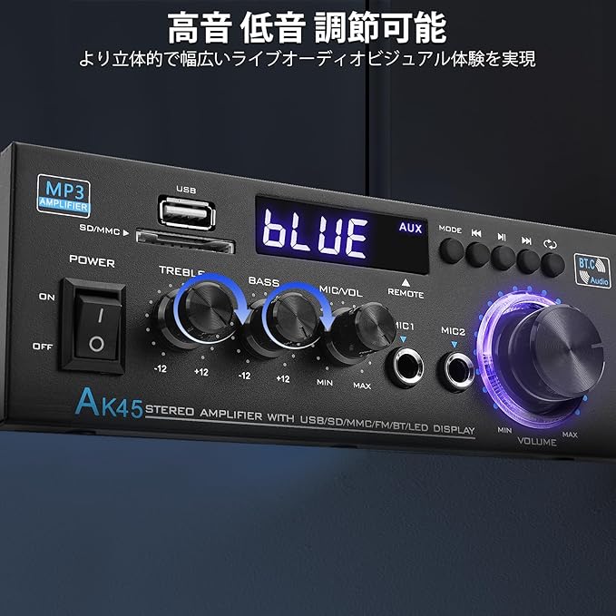 Bluetooth アンプ 5.0 HiFi ステレオ パワーアンプ レシーバー 2.0 チャンネル 2X40W ミニ アンプ 小型 ホーム オーディオ アンプ 低音/高音コントロール FM/USB/SD/MIC 入力 スピーカー用