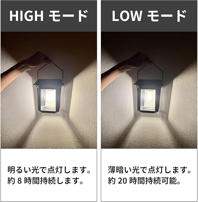 ★High/Low2つのモード:Highモード→明るい光で点灯して、約8時間持続可能。Lowモード→薄暗い光で点灯して、約20時間持続可能です。(※晴天の日に約3日間充電した場合の点灯時間です。)
