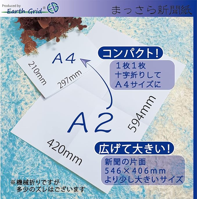まっさら新聞紙”新白雪” A2・十字折り/60枚 420 594mm 無地 新聞紙 国産紙 厚さ0.075mm 柔らかい紙(お絵描き/梱包材/包装紙/緩衝材/ペットシーツ/敷紙/引っ越し/野菜保存/食器保護/インコ/ハムスターなど) 白雪A2・十字折り/60枚