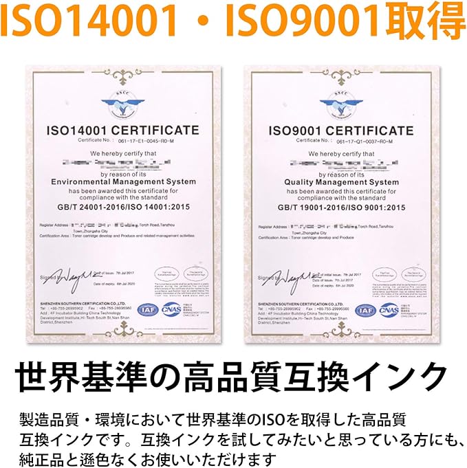 【互換インクデビューも失敗ナシ・高品質互換インク】 『純正インクを使っているけれど、経済性を考えたら互換インクも試したい』という方は多いはず。当社のインクは国際基準であるISO14001、ISO9001※を取得した工場で製造された高品質互換インク。初めて使う方も不安なく互換インクデビューできます。 ※ISO9001取得日:2018年9月14日、有効期限:2021年9月13日/ISO14001取得日:2018年9月12日有効期限:2021年9月11日