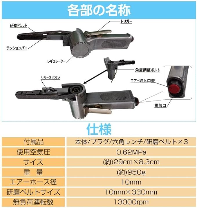 kaitou エアーベルトサンダー 10mm 角度調整 替えベルト3本付き 錆落とし 仕上げ