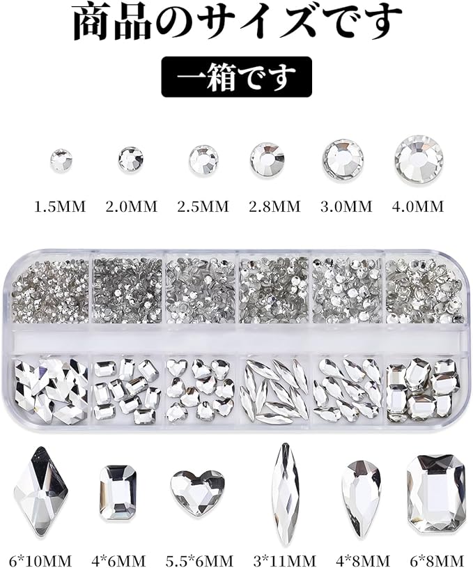 【ラインストーン商品詳細】:マニキュアドリルセットは、12種類のキラキラネイルストーン、細かくカットされ、エッジがきれいで、光の屈折率が高く、虹のような色を反射することができます。ネイルアートに最適、ネイル技術者や家庭のネイルアート愛好家に適しています。