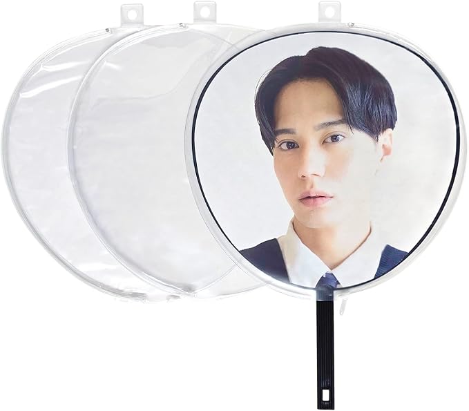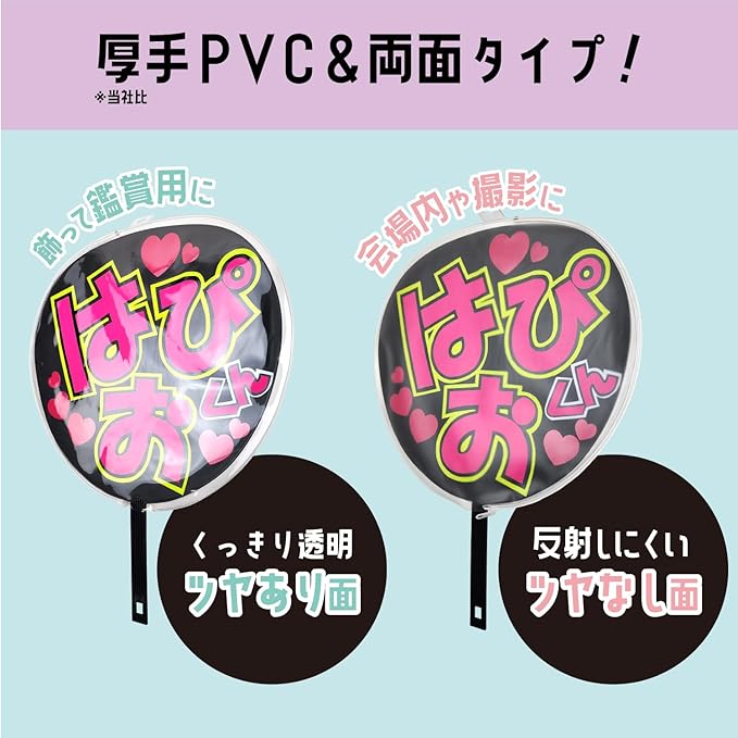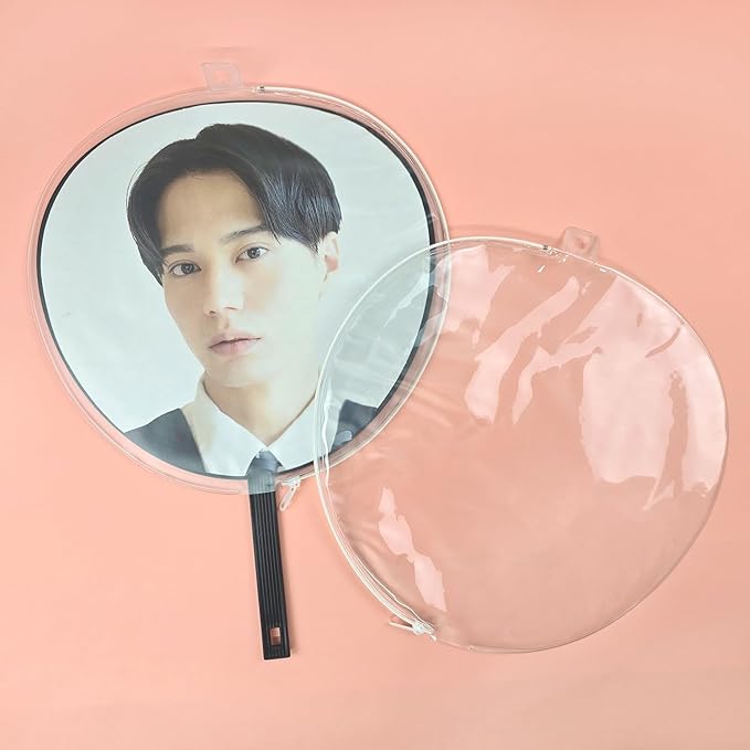 アイドル公式グッズの顔うちわや応援うちわにぴったり設計のファスナータイプの透明カバーです。壁などに飾れるミミ付き。