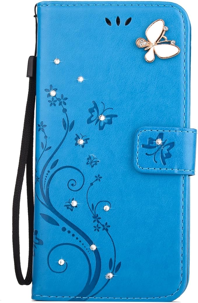 iphone XR 用 ケース 手帳型 おしゃれ OYIME かわいい きらきら ラインストーン お花 蝶々 デザイン 女性向け きれい 優雅 純色 カバー 横開き マグネット カード収納 耐衝撃 滑り防止 スマホケース ハンドメイド アィフォン XR 手帳型ケース PUレザー 携帯カバー (ブルー)
