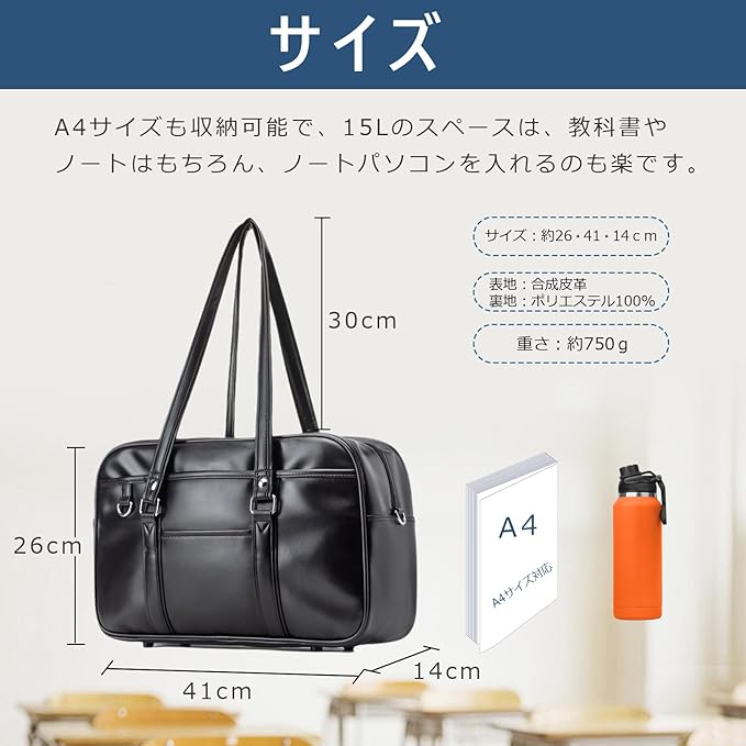大容量&収納抜群:41cm 26cm 14cmのスペースは、教科書やノートはもちろん、A4サイズの資料でも十分です。内部のネットポケットで水筒を立てて収納可能ですから、中の荷物を濡れる心配もありません。