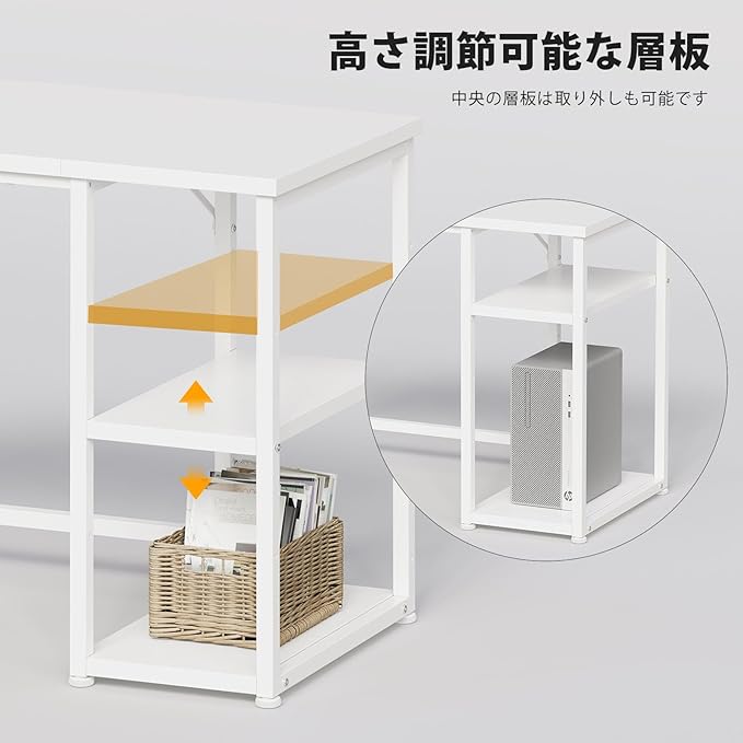 【棚は左or右に】デスクの棚の取り付け位置は状況によって左or右に自由に切り替えることができ、様々なシーンに対応できます。 また、このパソコンデスクのサイドポケットの位置も変えられます。棚の層板の取り付け位置も三つの選択があって、置くものによって層板を付けるようにしてください。