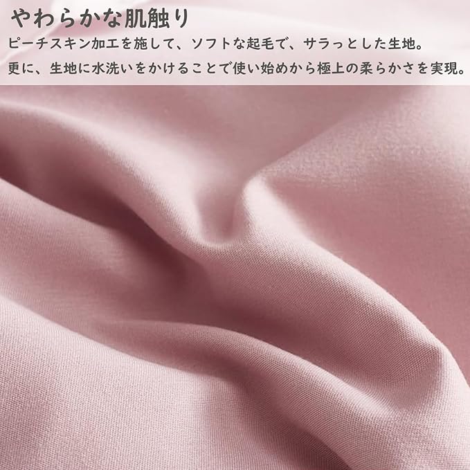 【ピーチスキン加工】: 柔らかい磨き再生繊維を採用、ピーチスキン加工を施して、ソフトな起毛で、サラっとした生地。更に、生地に水洗いをかけることで使い始めから極上の柔らかさを実現し、やわらかな肌触りを楽しめます。