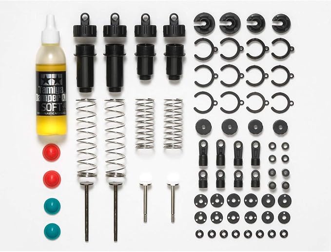 バギー1台分のダンパーセット。 (CVAダンパーミニ・・2本、ショート・・2本、計4本) 。 ダンパー部は「DT-03」のみならず多くのエントリーバギーに使用可能 (ダンパー長は各車両に合わせて組み立てる事が必要) 。