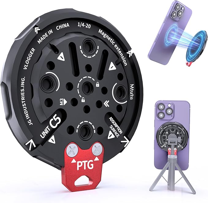 【自在なアングル調整】このマグネットマウントは片手で360 の角度調整が可能です。最良の撮影効果を得るには、スマホを直接回転させずに、持ち上げて設置または位置変更してください5つの1/4標準ネジ穴があり、適切なネジ穴を自由に選択し、角度を調整し、満足のいく写真を撮り、美しい生活を記録できます。さまざまなタイプのパン/チルトや三脚への取り付けに適しています。