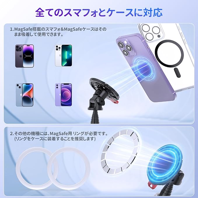 【MagSafeに対応&幅広い用途】MagSafeに対応で、クリップでで挟んだり、ネジで固定するの必要はなく、片手でわずか1秒で簡単に着脱が可能。強力なマグネット搭載、強い磁力で落下の悩みのなく、ごMagsafe式便利な生活を支援。C5マグネット式スマホマウントはマグネットリング付き、MagSafe機能を搭載していないスマホも使用できます。(吸着面はPVC製のため、プラスチック製のスマホケースが摩耗する可能性があります。)さまざまなタイプのジンバルや三脚への取り付けに適しており、スマホをモニターとして使用することもできます。